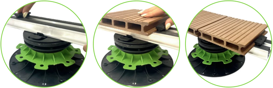 This system removes the need for screwing during deck installation. Thanks to its screwless design, the clips can be easily detached from the frame by rotating them 90 degrees counterclockwise, making it possible to dismantle the decking and reuse the clips.